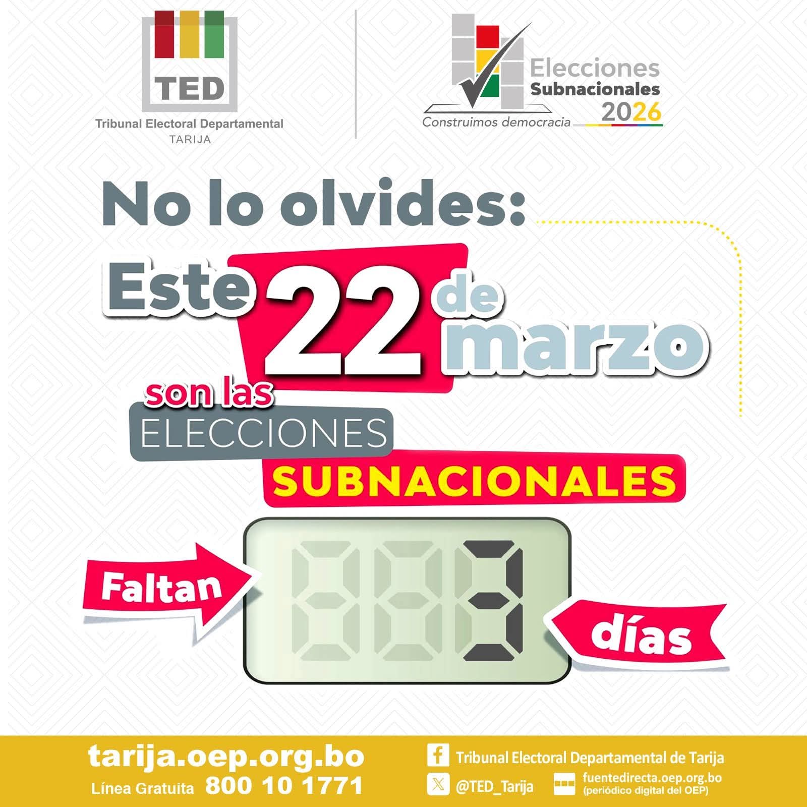 Uncategorized #𝗖𝘂𝗲𝗻𝘁𝗮𝗥𝗲𝗴𝗿𝗲𝘀𝗶𝘃𝗮 | 𝗘𝗹𝗲𝗰𝗰𝗶𝗼𝗻𝗲𝘀 𝗦𝘂𝗯𝗻𝗮𝗰𝗶𝗼𝗻𝗮𝗹𝗲𝘀 𝟮𝟬𝟮𝟲 Faltan 3 días para que el departamento de Tarija acuda a las urnas. El Tribunal Electoral Departamental trabaja intensamente para garantizar una jornada transparente y participativa este domingo 22 de marzo. #EleccionesSubnacionales2026 #TEDTarija #DemocraciaIntercultural DamianV Mar 20, 2026 0 Leer más