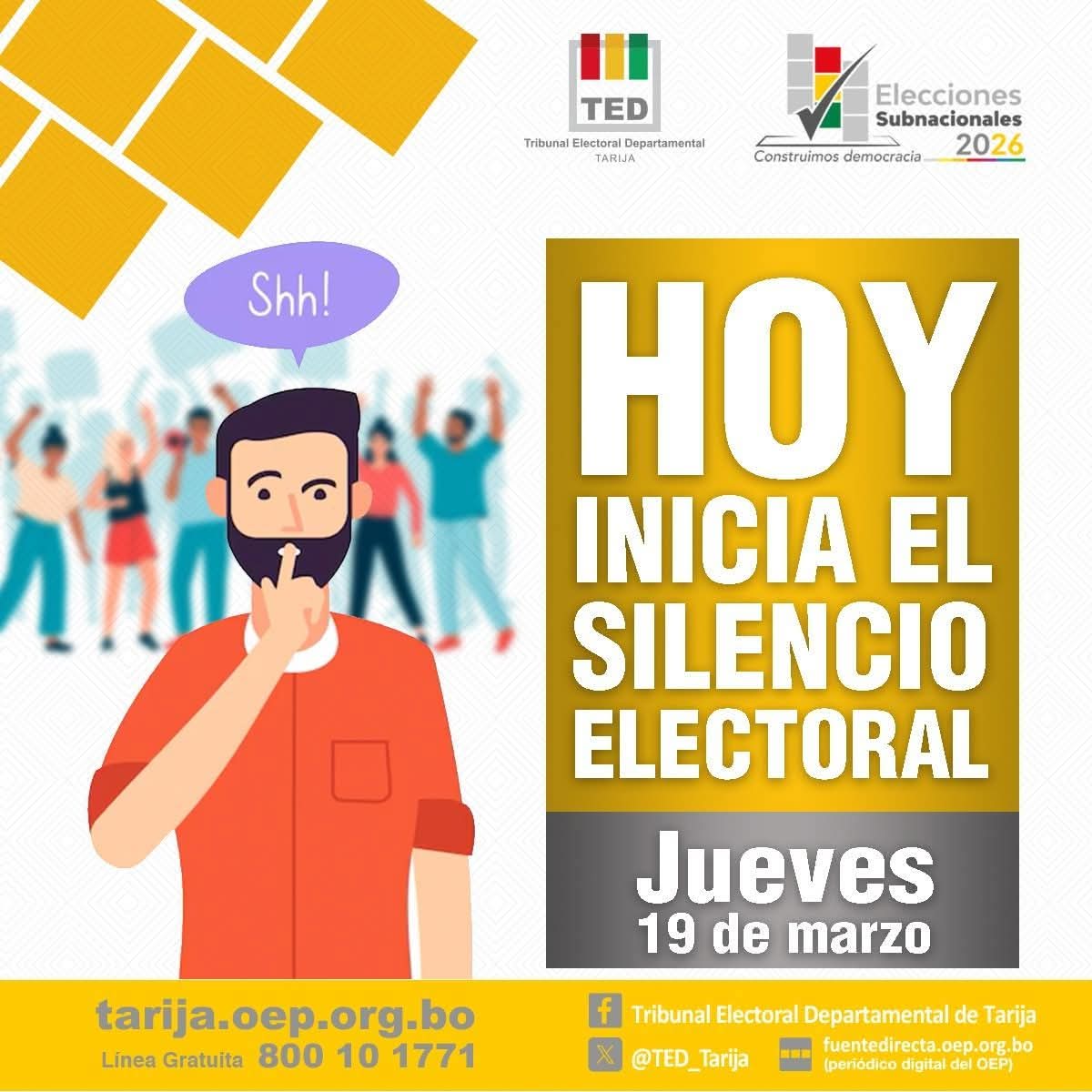 Uncategorized 𝗘𝗹𝗲𝗰𝗰𝗶𝗼𝗻𝗲𝘀 𝗦𝘂𝗯𝗻𝗮𝗰𝗶𝗼𝗻𝗮𝗹𝗲𝘀 𝟮𝟬𝟮𝟲 | 𝗜𝗻𝗶𝗰𝗶𝗼 𝗱𝗲𝗹 #𝗦𝗶𝗹𝗲𝗻𝗰𝗶𝗼𝗘𝗹𝗲𝗰𝘁𝗼𝗿𝗮𝗹 🤫⚖️ El TED Tarija informa que, a partir de las 00:00 de este jueves 19 de marzo, entra en vigencia el periodo de silencio electoral en todo el departamento. Esta medida, respaldada por la Ley N.° 026 del Régimen Electoral y el Decreto Departamental N° 010/2026, prohíbe toda difusión de propaganda y actividades proselitistas. El objetivo es garantizar que la ciudadanía cuente con un tiempo de reflexión libre de influencias antes de la jornada electoral de este domingo 22 de marzo. #EleccionesSubnacionales2026 #TEDTarija #Tarija #SilencioElectoral DamianV Mar 20, 2026 0 Leer más