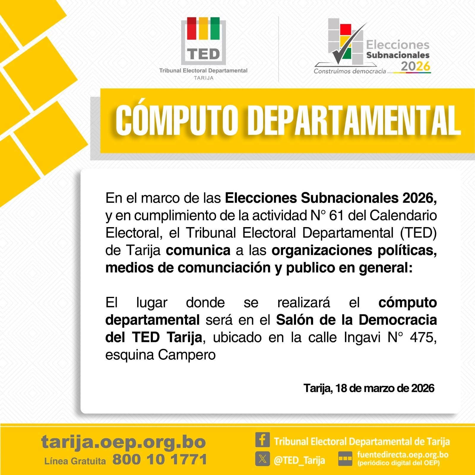 Uncategorized 𝐄𝐥𝐞𝐜𝐜𝐢ó𝐧 𝐝𝐞 𝐀𝐮𝐭𝐨𝐫𝐢𝐝𝐚𝐝𝐞𝐬 𝐃𝐞𝐩𝐚𝐫𝐭𝐚𝐦𝐞𝐧𝐭𝐚𝐥𝐞𝐬 𝟐𝟎𝟐𝟔 – 𝐒𝐞𝐠𝐮𝐧𝐝𝐚 𝐕𝐮𝐞𝐥𝐭𝐚 | 𝐈𝐧𝐯𝐢𝐭𝐚𝐜𝐢ó𝐧 La Sala Plena del Tribunal Electoral Departamental (TED) de Tarija, tiene el agrado de invitar a la ciudadanía, instituciones y medios de comunicación al acto de inauguración de la Jornada Electoral del proceso de Elección de Autoridades Departamentales 2026 Segunda Vuelta. DamianV Abr 18, 2026