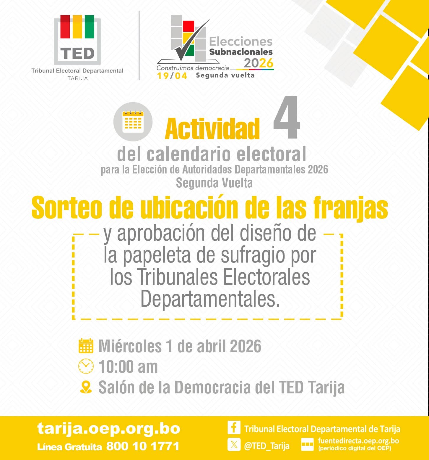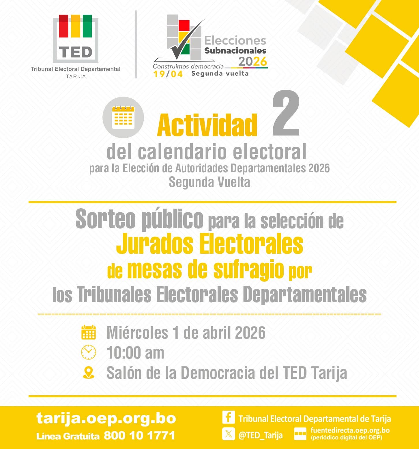 Uncategorized #eleccionessubnacionales2026 I En cumplimiento de la ๐๐๐ญ๐ข๐ฏ๐ข๐๐๐ ๐ ๐๐๐ฅ ๐๐๐ฅ๐๐ง๐๐๐ซ๐ข๐จ ๐๐ฅ๐๐๐ญ๐จ๐ซ๐๐ฅ ๐ฉ๐๐ซ๐ ๐ฅ๐ ๐๐ฅ๐๐๐๐ข๐จฬ๐ง ๐๐ ๐๐ฎ๐ญ๐จ๐ซ๐ข๐๐๐๐๐ฌ ๐๐๐ฉ๐๐ซ๐ญ๐๐ฆ๐๐ง๐ญ๐๐ฅ๐๐ฌ ๐๐๐๐ – ๐๐๐ ๐ฎ๐ง๐๐ ๐๐ฎ๐๐ฅ๐ญ๐, el Tribunal Electoral Departamental de #Tarija, realiza este miรฉrcoles 1 de abril el Sorteo pรบblico para la selecciรณn de Jurados Electorales de mesas de sufragio. ๐ Miรฉrcoles 1 de abril ๐10:00 ๐Salรณn de la Democracia del TED Tarija DamianV Abr 1, 2026 0 Leer mรกs
